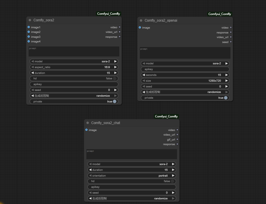 Comfly_sora2,Comfly_sora2_chat,Comfly_sora2_openai,这3个节点都能生成sora2视频只是各个节点使用的请求接口不一样,节点上的参数不一样,价格无差别。Comfly_sora2,Comfly_sora2_openai两个节点请求可以在我的api 网站的异步任务里面查看具体进度和情况,失败会退回钱。Comfly_sora2_chat是chat兼容格式,无法在异步任务查看,但可以在comfyui后台找到Found data previewURL:https://asyncdata.net/web/task_01k8afznmffp1bbdypg5htznb4类似这个请求成功后会显示的链接,点进去就能查看任务进度,链接长期有效。但任务失败了无法退回钱!请仔细选择自己合适的节点。