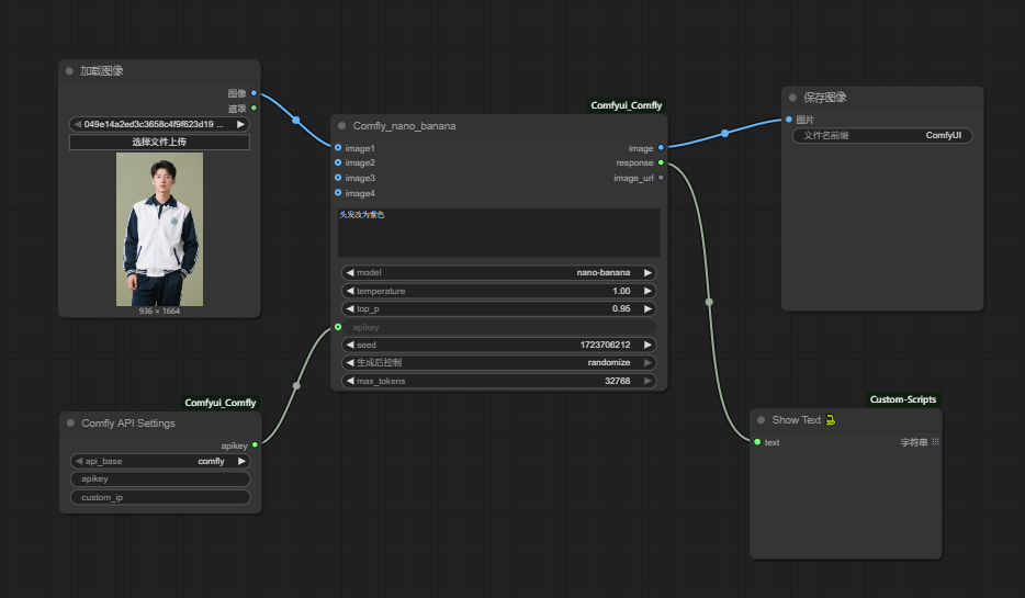 Comfly API Settings的参数说:这个节点是专门用来设置api线路(有4个选项,comfly是本站,ip:custom_ip只有选择ip才需要填写,地址需要加群获取,hk和us线路 如果遇到故障,可以切换来使用,增加稳定性)